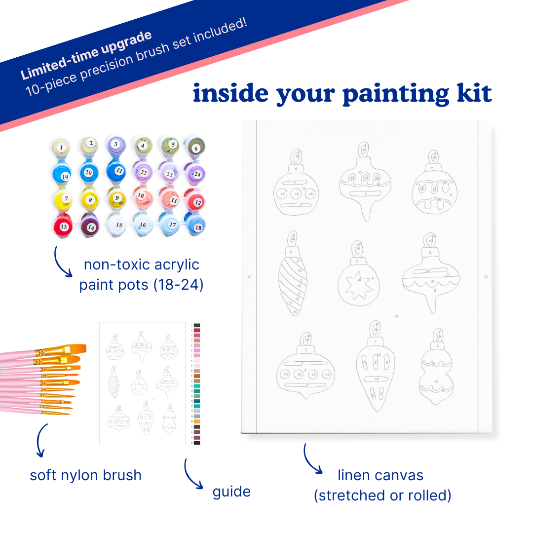 unlike other brands, we exclusively use linen canvas because it provides a stronger, smoother surface and is proven to be more durable. and we know first hand, this defines your painting experience. all our kits come with: