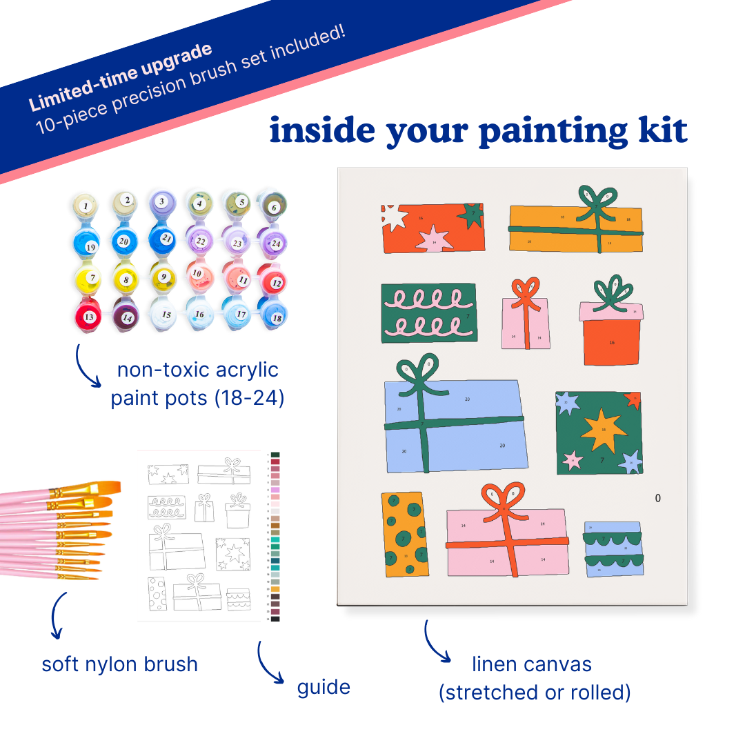 This kit is pure holiday serotonin. The playful gift shapes, bright palette, and clean Scandi-inspired lines make painting relaxing and deeply satisfying. It’s the kind of artwork that instantly lifts your mood and earns an annual spot in your festive décor.