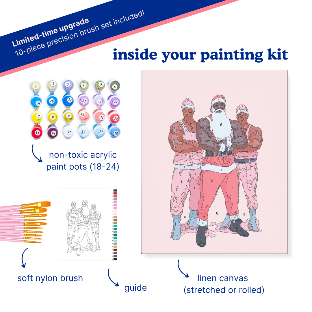 Welcome to Santa’s Flex Factory, where Christmas spirit meets gym energy and festive cheer comes with a side of serious biceps. This paint-by-numbers kit captures Santa and his two ultra-buff buddies posing like they’re shooting the cover of a North Pole Fitness calendar and honestly, we’re obsessed.